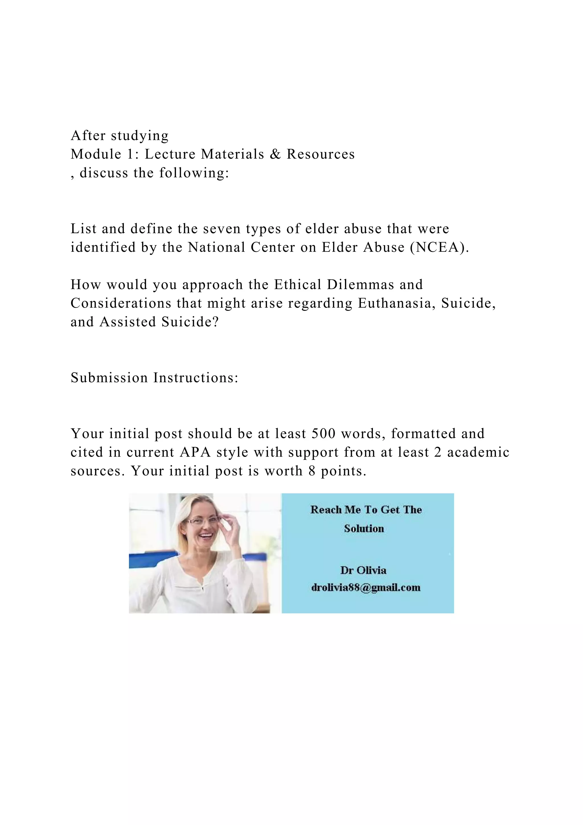 The document outlines an assignment focused on elder abuse, specifically identifying seven types recognized by the National Center on Elder Abuse (NCEA) and discussing ethical dilemmas related to euthanasia, suicide, and assisted suicide. It requires an initial post of at least 500 words formatted in APA style with citations from at least two academic sources. The assignment is scored out of 8 points.
