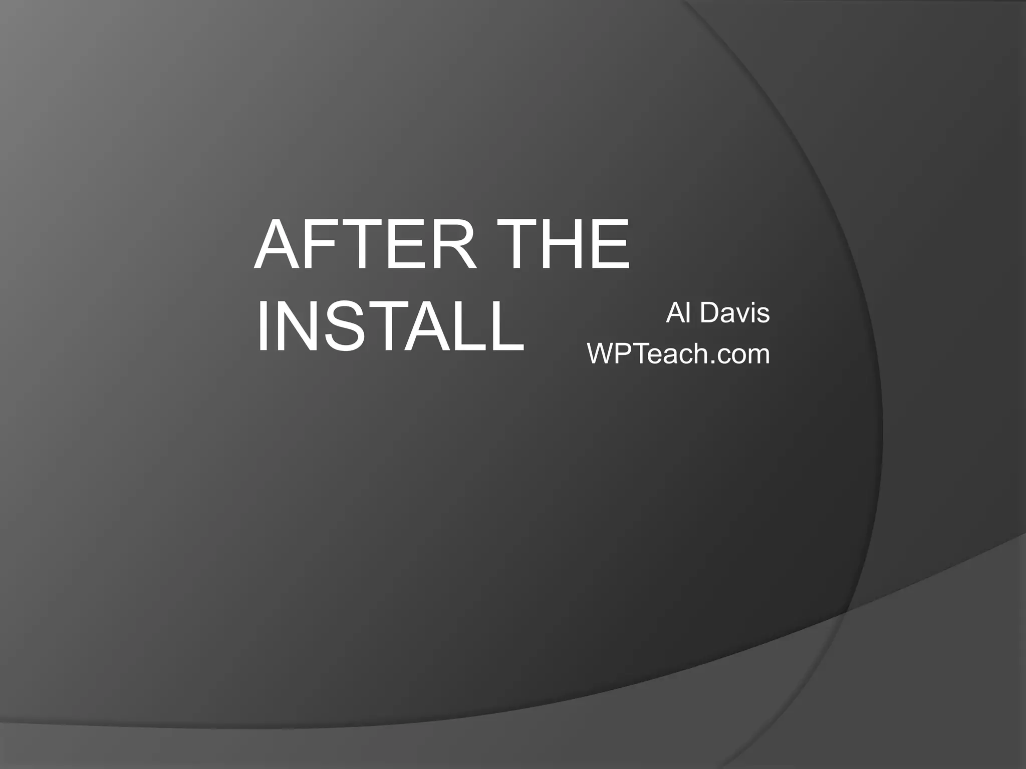 This document provides instructions for 10 things to do after installing WordPress before writing the first post. These include changing the default admin, adding a security plugin, changing permalinks, activating Akismet, installing WordPress SEO by Yoast, activating Google Analytics, adding categories, changing the blog tagline, installing a theme, and backing up the site for protection. The document recommends specific plugins and actions to take to optimize security, SEO, analytics, and organization of the new WordPress site.
