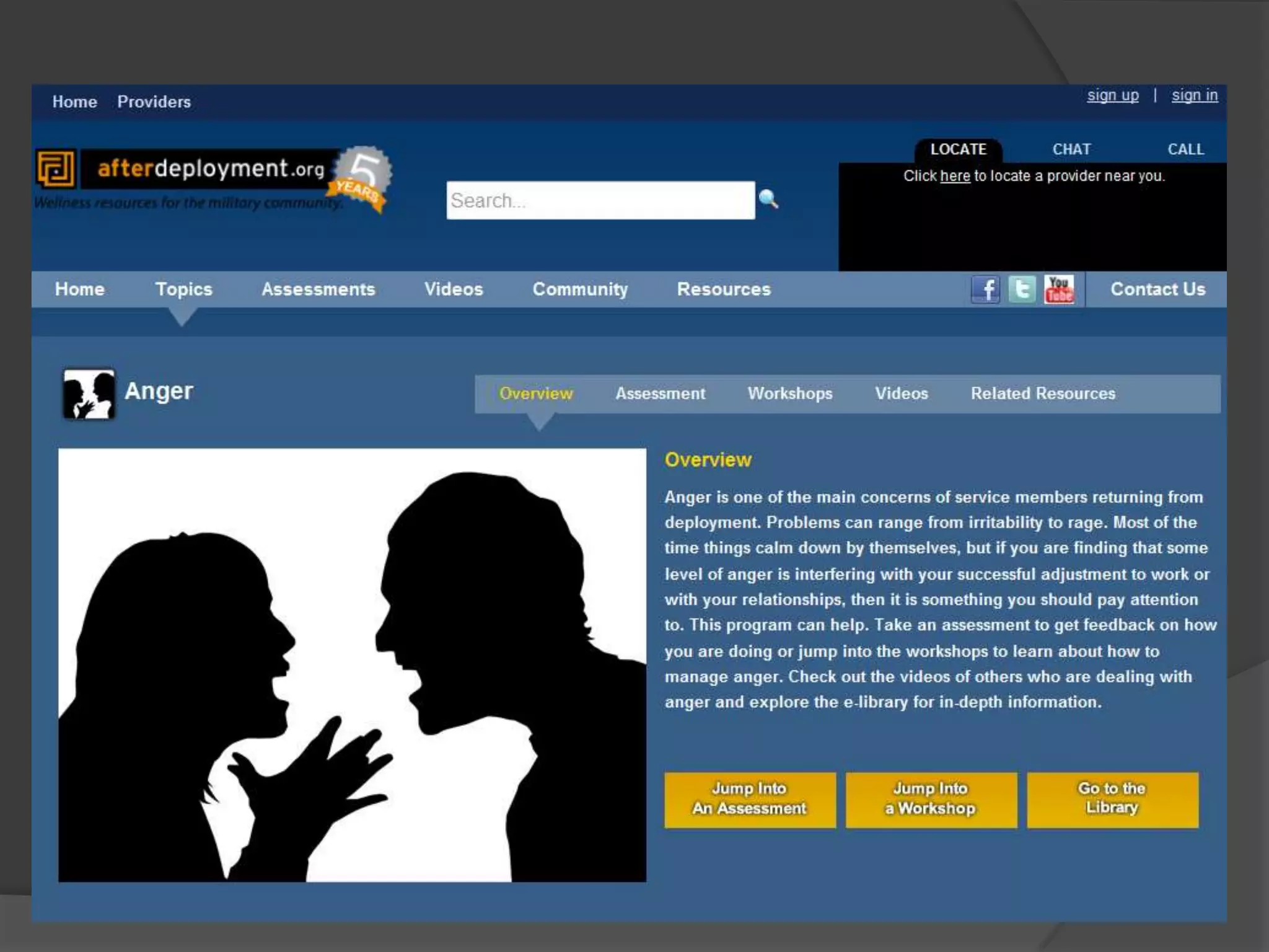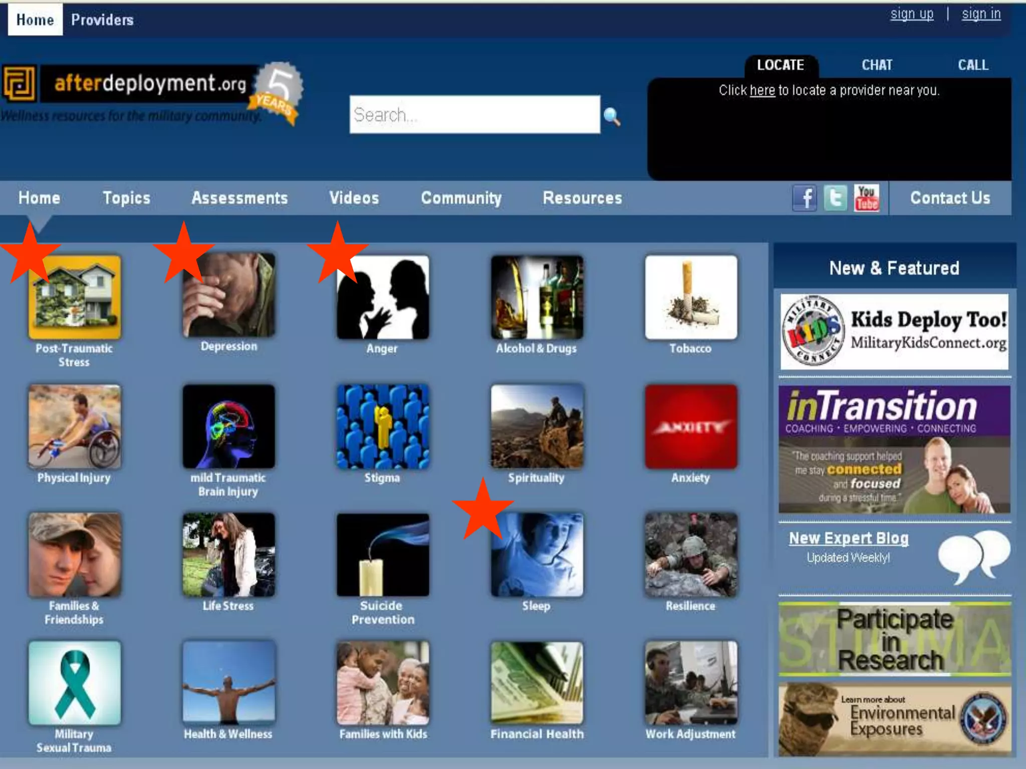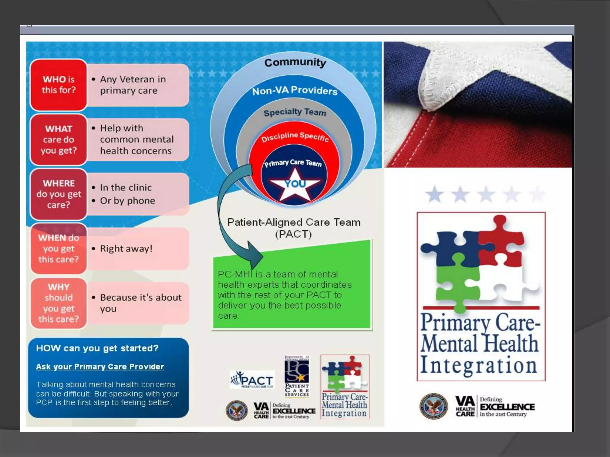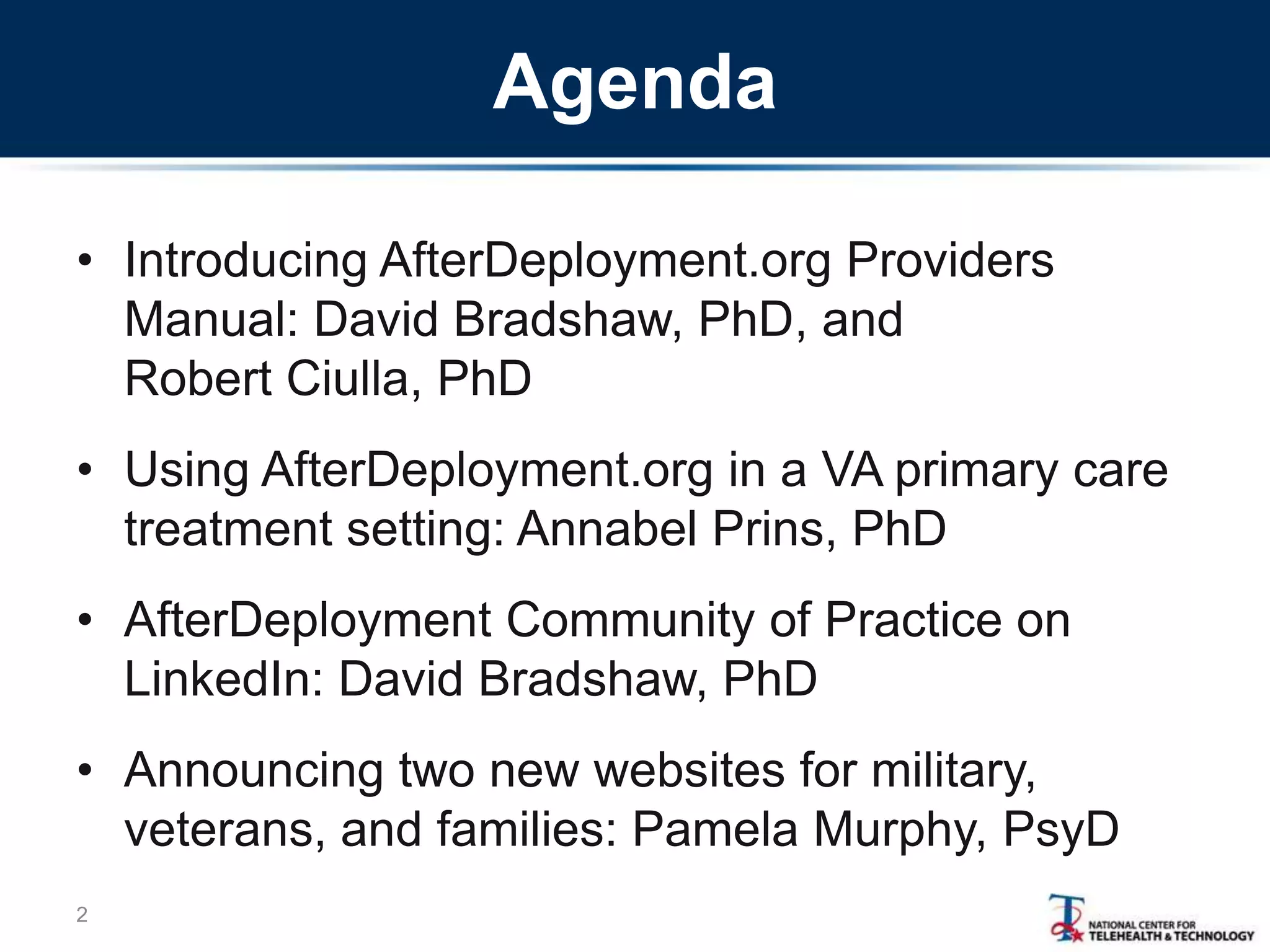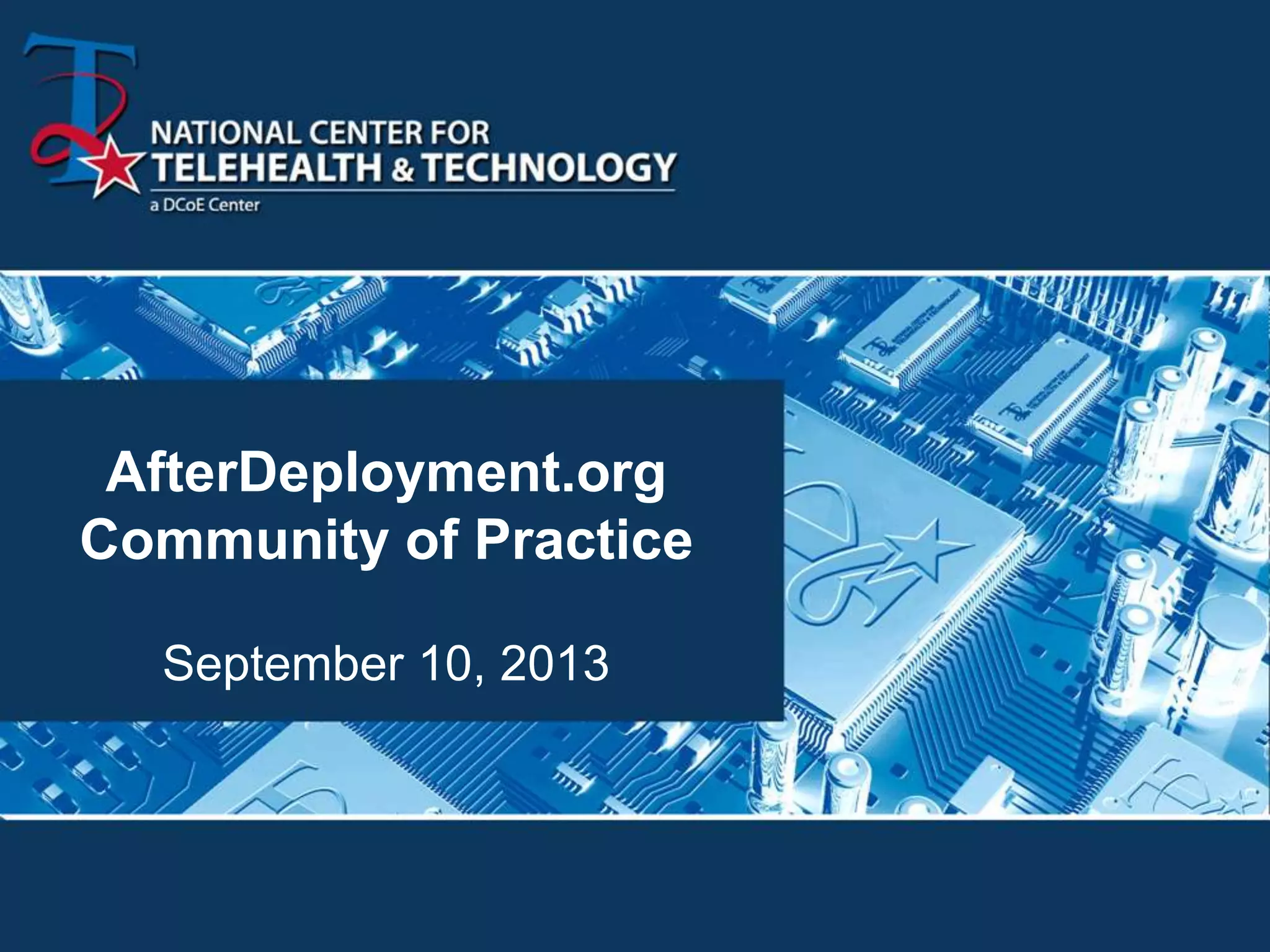 The afterdeployment.org community of practice agenda from September 10, 2013, highlights the introduction of a providers manual focused on assisting service members, veterans, and their families in managing challenges post-deployment. It outlines various tools and resources available on the website, such as an interactive workbook and educational materials, specifically addressing topics like PTSD and depression. The discussion also emphasizes the integration of mental health services in VA primary care settings and the establishment of an online community for healthcare providers interested in utilizing these resources.
