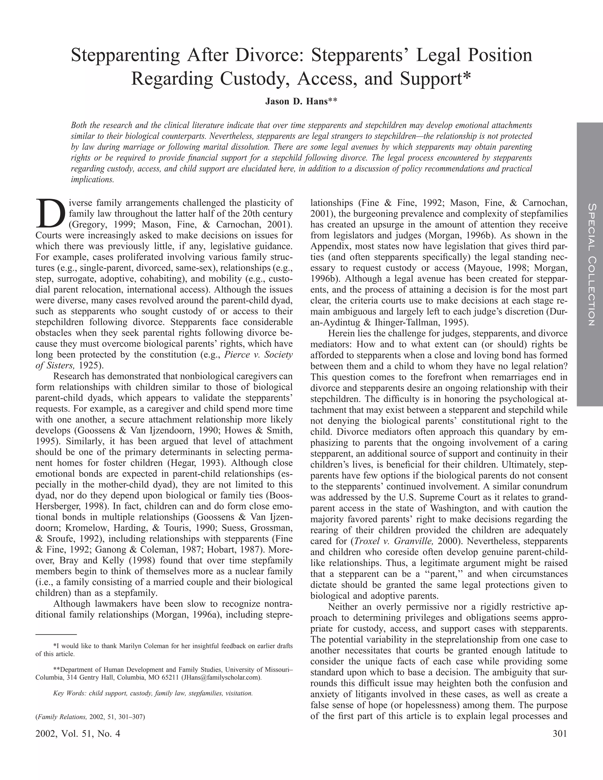 This document discusses stepparents' legal position regarding custody, access, and support of stepchildren after divorce. It notes that while stepparents and stepchildren may develop emotional attachments, stepparents have no legal rights to the children. There are some legal avenues for stepparents to obtain parenting rights or be required to provide financial support, but the criteria courts use to make these decisions remains ambiguous. The document examines legal processes and judicial tendencies regarding stepparents seeking custody or visitation after divorce, as well as potential obligations for stepparents to provide child support. It concludes by recommending policies to help clarify this complex issue.