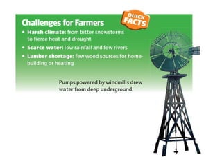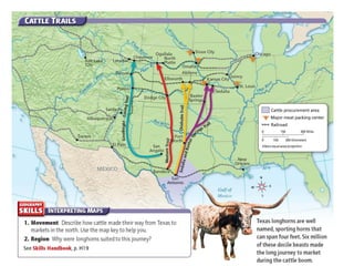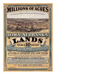 2) New legislation like the Homestead Act of 1862 offered free or cheap land, incentivizing farmers to settle the West. Transcontinental railroads also promoted western migration.