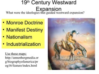 1) Ideologies like Manifest Destiny and nationalism guided westward expansion, as the US sought to expand its territory across the continent.