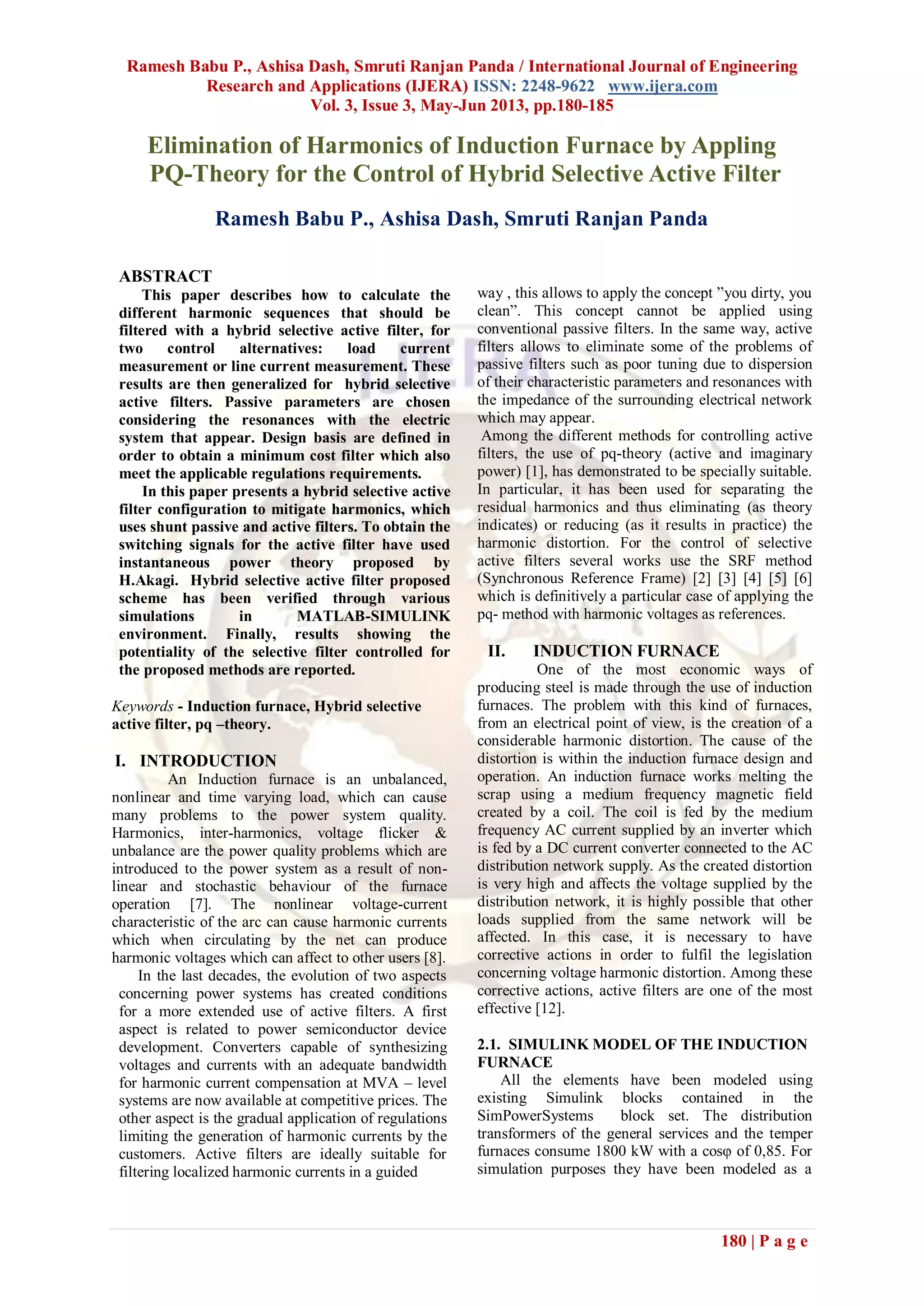 This document summarizes a research paper that proposes a hybrid selective active filter configuration to mitigate harmonics from an induction furnace. The hybrid filter uses both shunt passive and active filters. PQ theory is used to control the active filter and obtain switching signals. Simulations in MATLAB show the potential of the selective filter to control harmonics. The THD of supply currents is reduced from over 25-37% without the filter to under 2% with the filter. The research demonstrates an effective method for compensating harmonics from an induction furnace load using a hybrid selective active filter controlled by PQ theory.