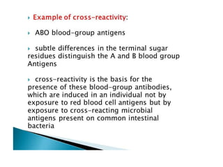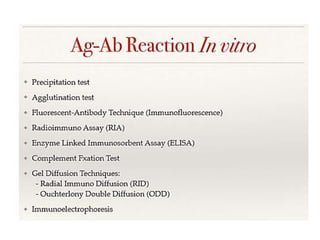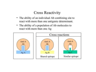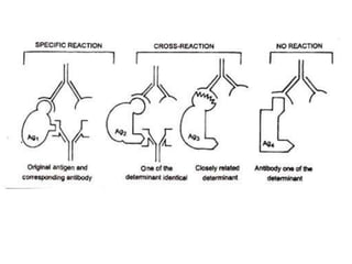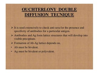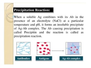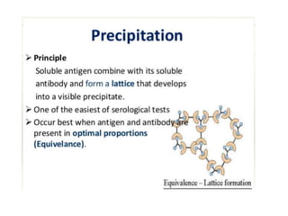 A and B antigens help determine blood types and are present in various body fluids and tissues. Antigens and antibodies can form lattices through bivalent and polyvalent interactions, resulting in precipitation. Precipitation reactions can be measured through techniques like immunodiffusion assays and radial immunodiffusion to analyze antigen-antibody interactions and concentrations. Agglutination, another antigen-antibody reaction, involves antibody-mediated clumping of particulate antigens and is used for applications like blood typing and bacterial infection diagnosis.