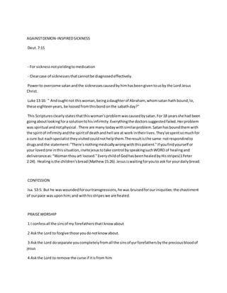 This document discusses demon-inspired sickness and how to overcome it through faith in Jesus Christ. It provides biblical references showing that some illnesses are caused by Satan binding people. For 18 years, one woman's problem was diagnosed but not cured by doctors until Jesus healed her on the Sabbath, showing the affliction was spiritual not physical. Many today experience similar demonic bondages causing sickness that does not respond to treatment. The passage encourages inviting Jesus to take control and speak healing over loved ones, as all believers have been healed by Christ's stripes. It provides a confession and instructions for praise, worship, and deliverance from generational curses and demons.