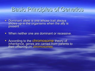 The document discusses both the principles of genetics as well as arguments against designer babies. It defines genetic disorders like Down Syndrome and cystic fibrosis. It also summarizes the goals of the Human Genome Project to provide a complete sequence of the human genome. The document then presents two arguments against designer babies. The first is that children should be loved for who they are, not what they can do for others. The second argument is that designer babies are at risk of genetic diseases and early death due to the techniques used to genetically modify embryos.