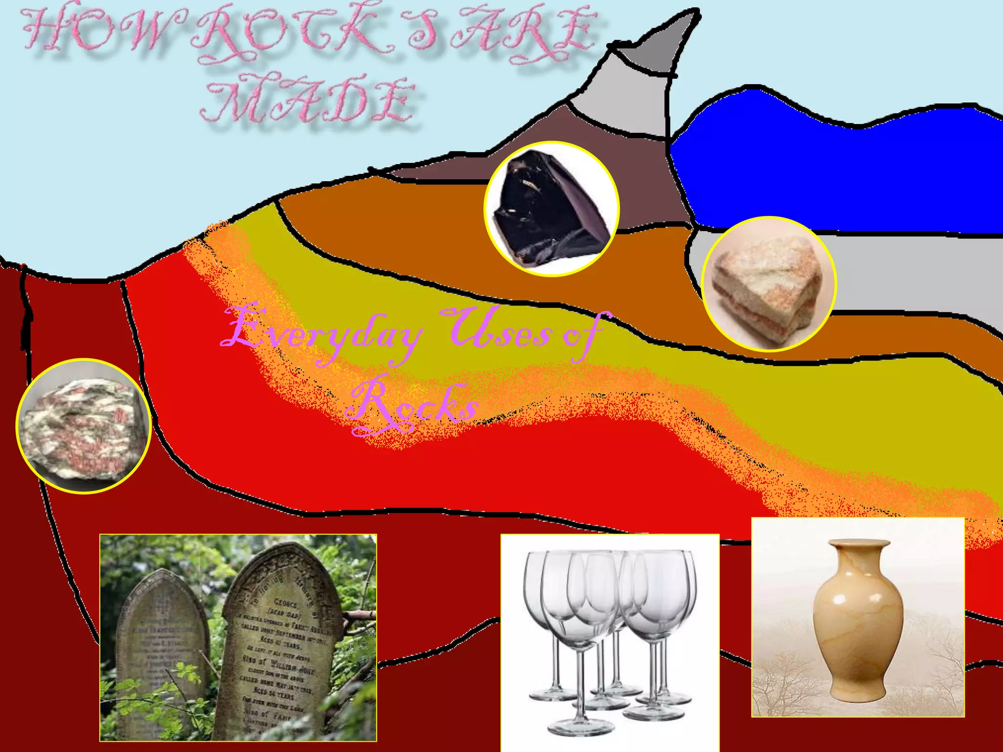 This document discusses the three main types of rocks: sedimentary, metamorphic, and igneous. Sedimentary rocks are formed from sediment layers over time, usually at the bottoms of lakes and oceans. Metamorphic rocks have been changed by extreme heat and pressure over time. Igneous rock forms as magma cools and solidifies, either above or below the Earth's surface. The document then lists everyday uses of each type of rock.