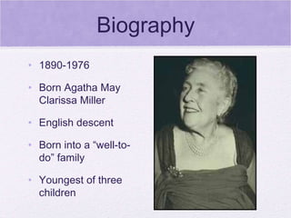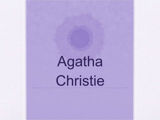Agatha Christie was an English writer born in 1890 who is considered the best-selling novelist of all time. She wrote over 66 mystery novels and short stories, many featuring characters such as Hercule Poirot and Miss Jane Marple. Christie published her first novel The Mysterious Affair at Styles in 1920, introducing the detective Hercule Poirot. Some of her most popular works include The Murder of Roger Ackroyd, Murder on the Orient Express, and Death on the Nile. She became widely known as the Queen of the Golden Age of detective fiction.