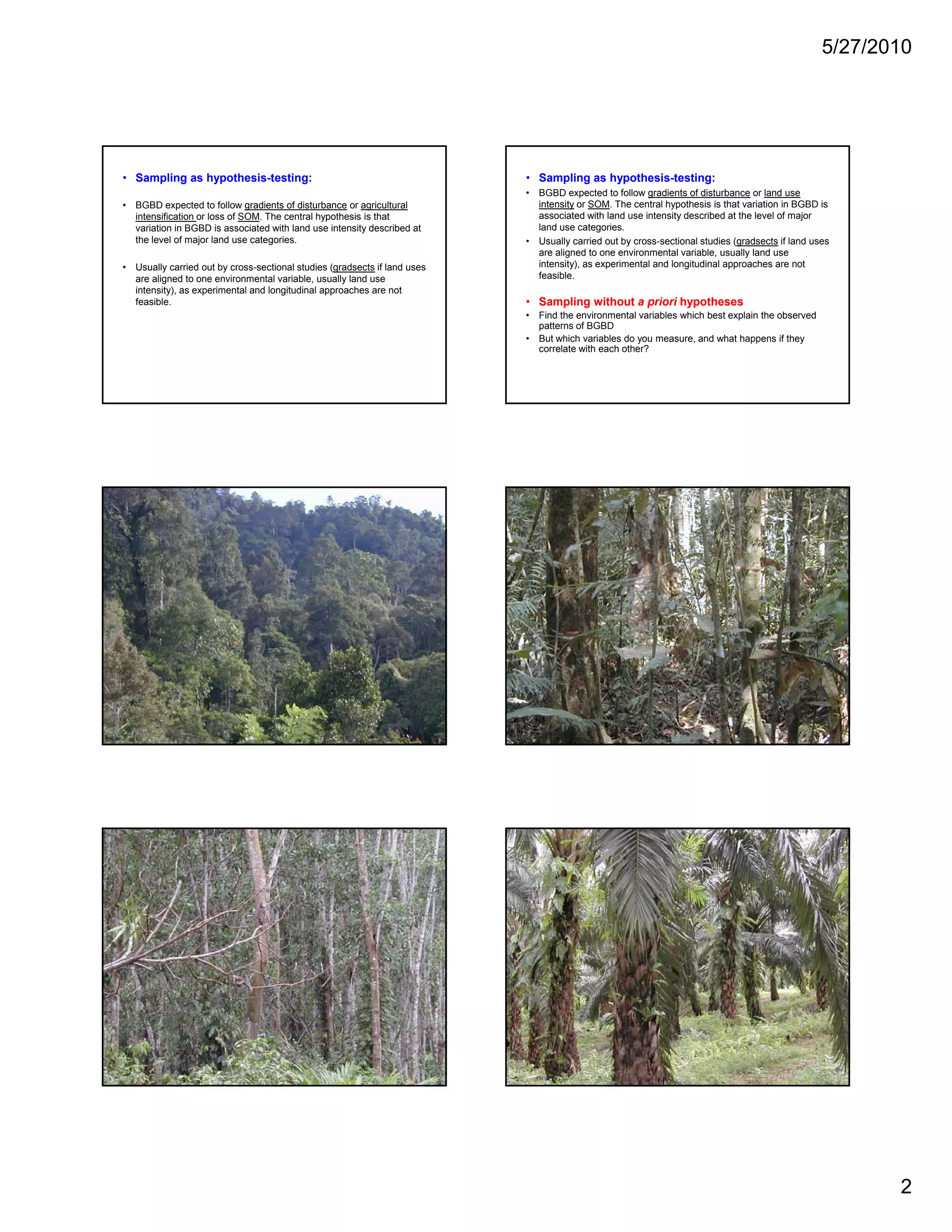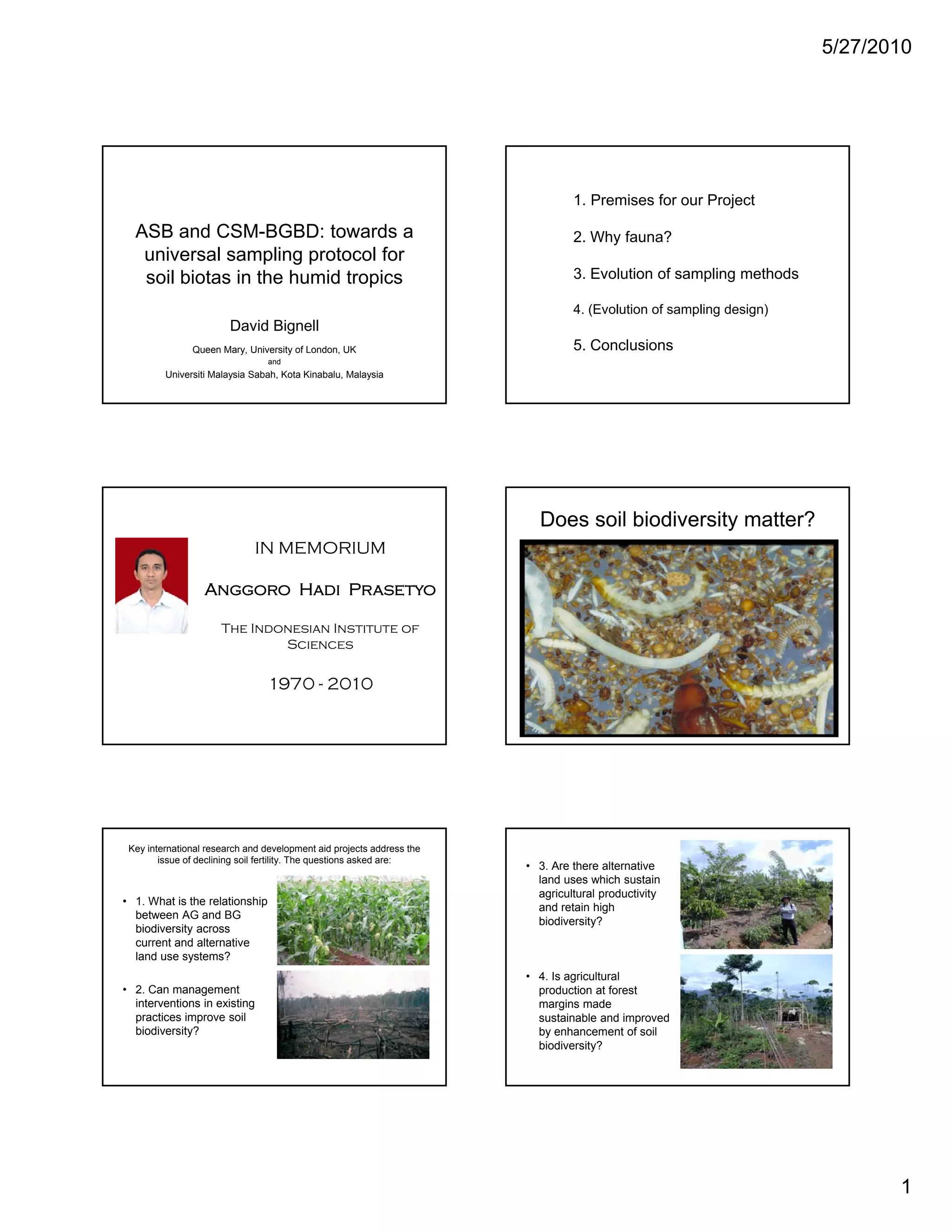 The document discusses the significance and methods of sampling soil biodiversity in humid tropics as part of a project led by researchers from Queen Mary University and Universiti Malaysia Sabah. It highlights the relationship between soil biodiversity and agricultural practices, the challenges of measuring biodiversity, and the various land use types and their impact on conservation efforts. Additionally, it outlines the evolution of sampling methods and provides a comprehensive framework for effective biodiversity management in tropical landscapes.