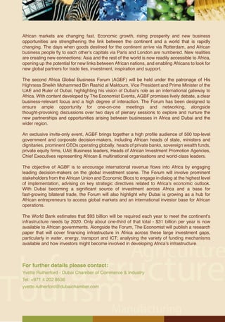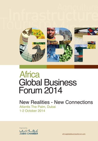 The document summarizes an upcoming conference called the Africa Global Business Forum (AGBF) that will take place in Dubai from October 1-2, 2014. The forum aims to encourage international investment in Africa and foster new partnerships between African and Middle Eastern businesses. It will bring together 500 government and corporate leaders from Africa and Dubai to discuss key industry sectors in Africa like agriculture, infrastructure, mining, tourism and manufacturing. The event is designed to provide networking opportunities and discussions around how Dubai can serve as a hub for African companies to access global markets. A accompanying research paper will also analyze financing options for Africa's large infrastructure needs.