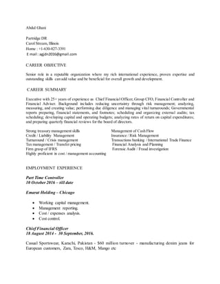 Abdul Ghani is an experienced CFO and financial executive with over 25 years of international experience in manufacturing, retail, and technology companies. He is seeking a senior financial role where he can add value through his expertise in financial management, turnarounds, strategy, and leadership. His background includes roles as CFO, Financial Controller, and Financial Adviser for companies in Pakistan, Jordan, Bahrain, and the United States.