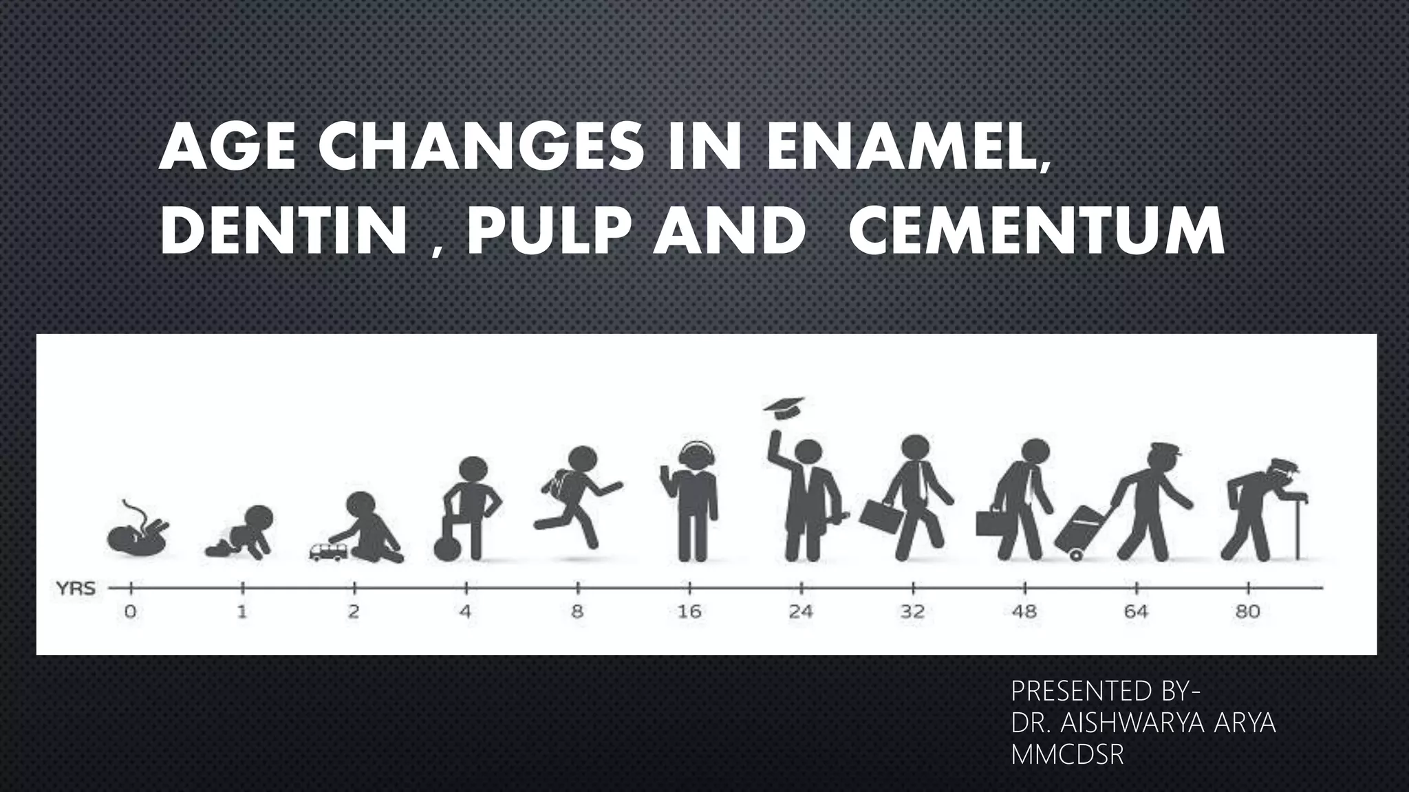 The document discusses age-related changes in dental tissues, including enamel, dentin, pulp, and cementum, emphasizing the biological processes and factors influencing aging. Various theories of aging are presented, along with methods of dental age estimation and the significance of these changes in dentistry. The impact of aging on tooth structure, including chemical, physical, and morphological alterations, is explored, highlighting the importance of understanding these changes for dental treatment and forensic evaluation.