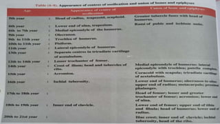 The document discusses methods for estimating a person's age, including by examining their teeth, ossification of bones, and secondary sexual characteristics. It notes that a doctor's age estimate is not proof but an opinion. It describes analyzing teeth for age estimation, including Gustafson's criteria of attrition, periodontitis, secondary dentine formation, cementum apposition, root resorption, and transparency. Ossification of bones is also examined, noting the centers of bone growth that appear during pregnancy and after birth. The accuracy of age estimation decreases after age 25 when premature aging may occur. The legal process for determining a person's age in cases is also outlined.
