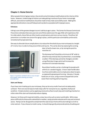 This document discusses modifications that can be made to homes to help people age in place safely and independently. Some key points: