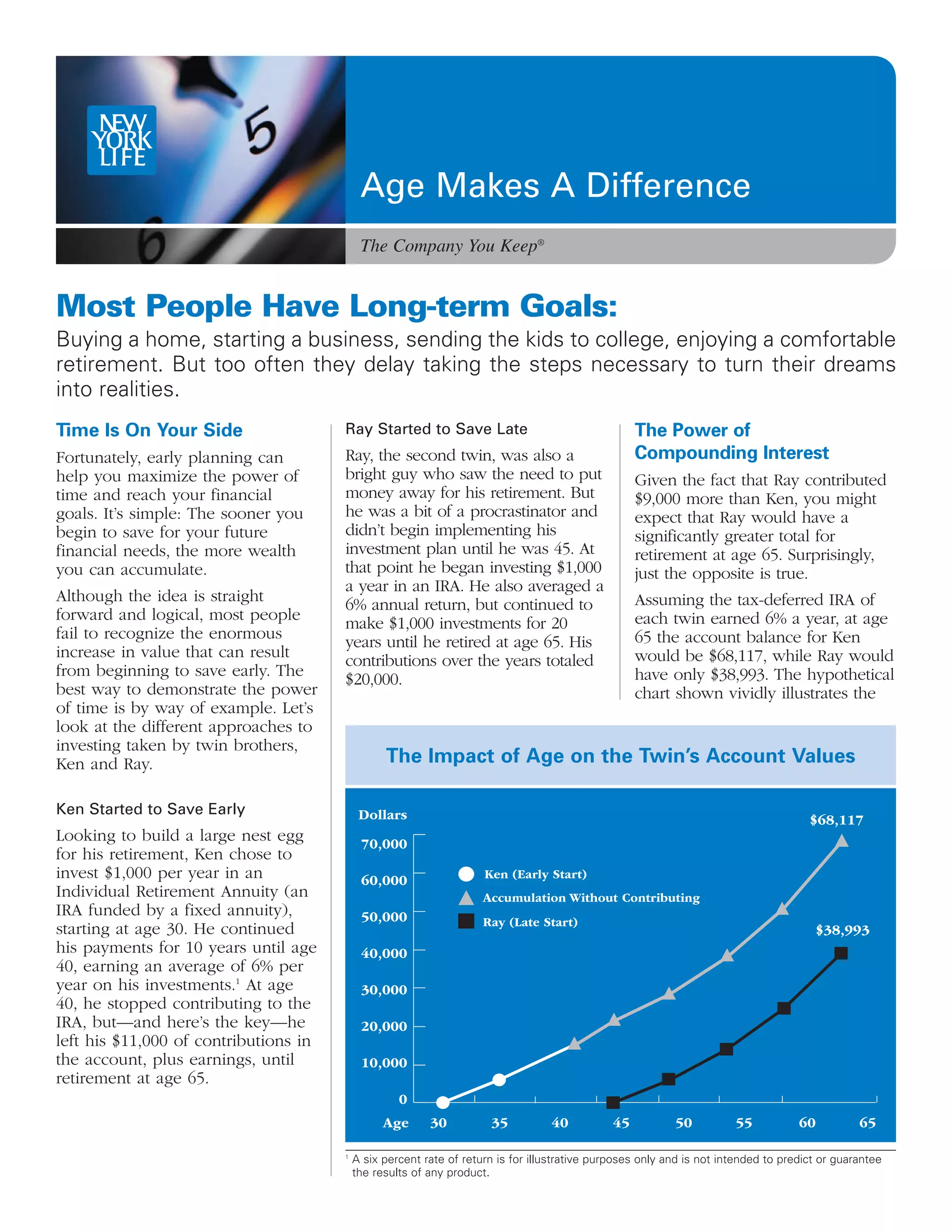 The document highlights the importance of early savings and investment planning for achieving long-term financial goals, illustrated through the comparison of twin brothers Ken and Ray. Ken, who started saving at age 30, accumulated significantly more wealth by age 65 compared to Ray, who began investing later. It emphasizes that delaying financial decisions, like purchasing life insurance, can lead to missed opportunities and financial risks.