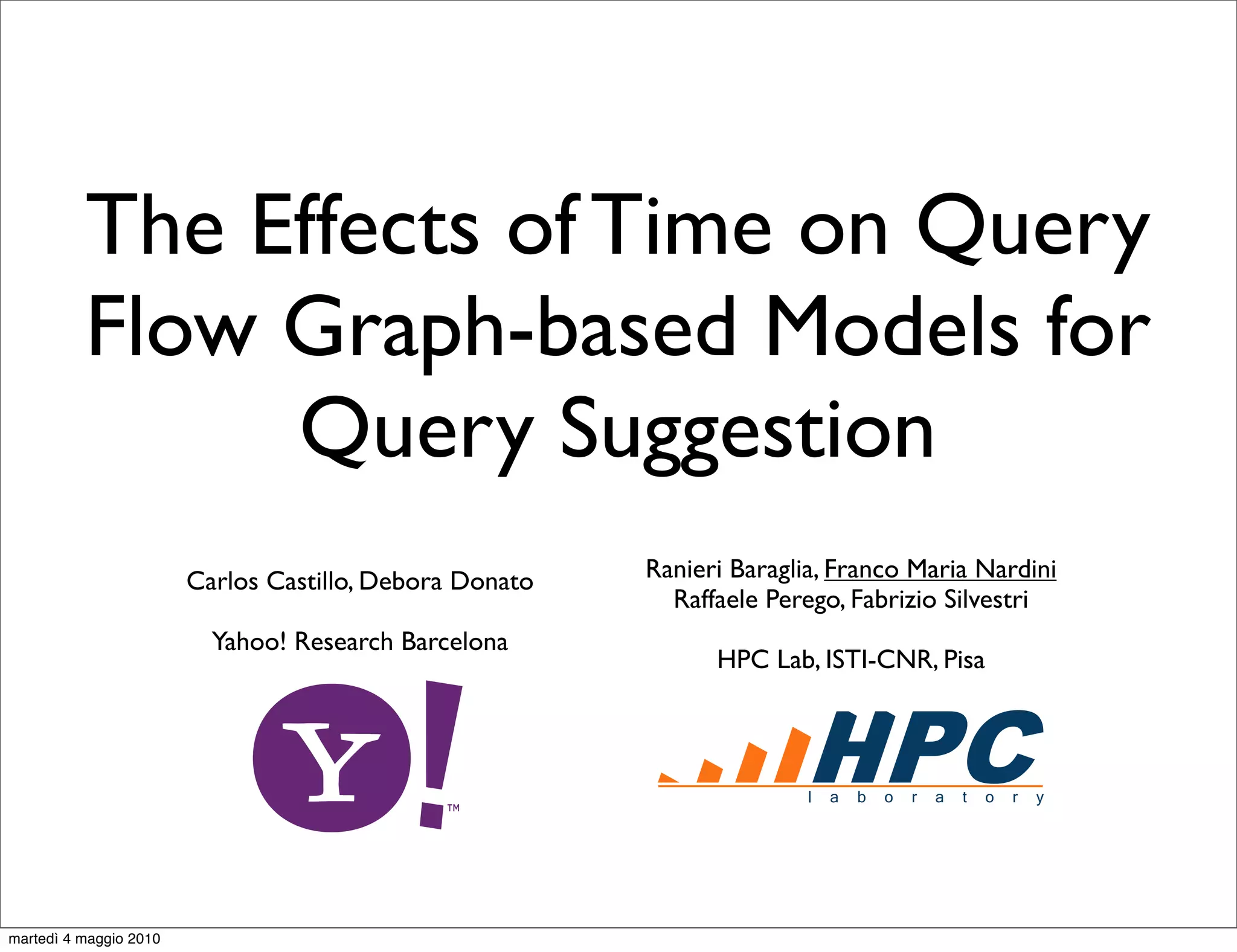 The document discusses the negative effects of time on query flow graph (QFG)-based models used for query suggestion in search engines, highlighting that the ability to generate relevant suggestions diminishes over time. It aims to extend existing models by introducing methodologies for effectively updating them to adapt to evolving data and outlines an experimental framework based on AOL query logs to evaluate these models. Attempts to counter aging effects in query suggestion, including the implementation of a distributed algorithm for model updates, are explored.