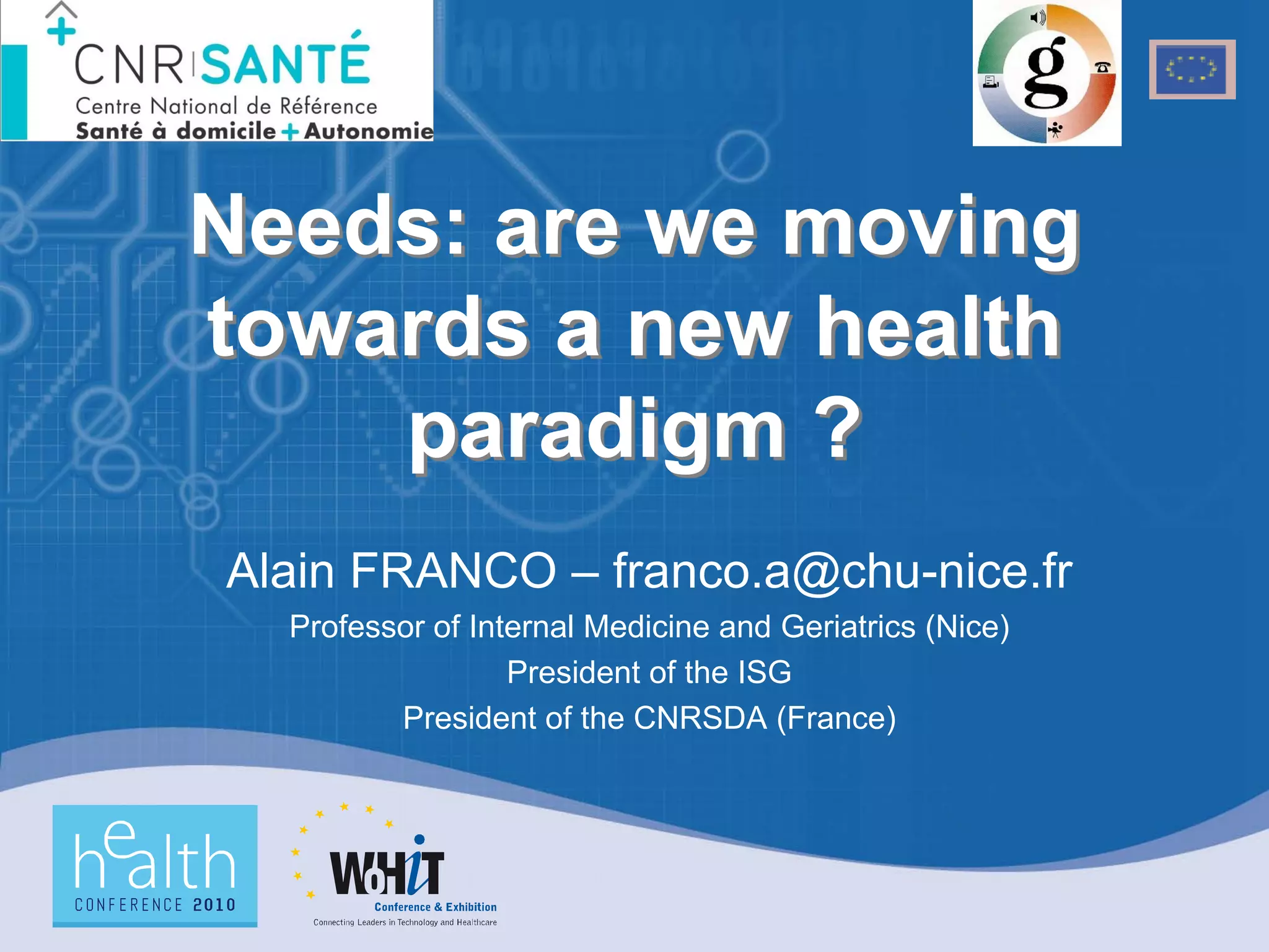 The document discusses a shift towards a new health paradigm focusing on aging, frailty, and the role of technology in elderly care. It highlights the need for a functional approach to healthcare that addresses the lived experiences of older adults, including environmental and human rights needs. Ultimately, it emphasizes the importance of gerontechnology in enhancing quality of life and reducing caregiver burden.