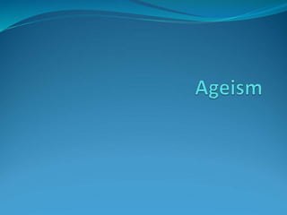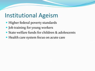 This document discusses various forms of institutional ageism, including higher standards for poverty assistance for youth, myths about aging, and consequences of ageism. It notes that elderly individuals commonly respond to ageism through acceptance, denial, avoidance, or reform. The text highlights several issues: between 1-3 million elderly face abuse annually but only a small percentage is reported; lack of preventive healthcare and research for older adults; most nursing homes fail to meet standards; and ageism exists in emergency services, the workplace, and media which portrays few older characters.