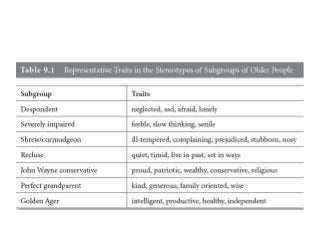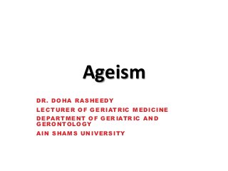 Ageism refers to stereotyping, prejudice, and discrimination against individuals based on their age. There are three main components of ageism: cognitive (beliefs and stereotypes about older people), affective (prejudicial attitudes), and behavioral (discriminatory practices). Ageism occurs at personal, institutional, and societal levels and can be intentional or unintentional. It negatively impacts older adults' self-esteem, participation in society, and access to quality services. While ageism is prevalent, discrimination in old age must be addressed by challenging negative stereotypes, promoting intergenerational contact, and changing policies that marginalize older groups.