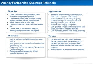 The document discusses agency banking partnerships, highlighting their benefits such as cost efficiency and increased customer reach, while also addressing potential weaknesses like control over agent behavior and the necessity for effective partner management. Various successful models from around the world are presented, including examples from Brazil, the Philippines, and Pakistan, showcasing how agency banking can enhance financial inclusion. Overall, the session emphasizes the importance of collaboration with diverse intermediaries to scale banking services effectively.