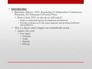 The document describes the typical life cycle of a regulatory agency according to Bernstein and Marver's theory of bureaucratic politics. It progresses through four stages: gestation, youth, maturity, and old age. Key characteristics are described for each stage, including rapid growth and conflict in youth giving way to protection of regulated industries and capture in later stages. An example of the life cycle of the Interstate Commerce Commission is then provided from its creation in 1887 through its dissolution in 1995.