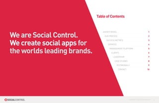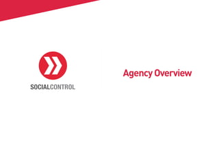 Social Control is a social media agency that helps brands control their social presence. They create social apps that build loyalty and engage fans through community and evangelism. Their process involves discovery, design, development, and deployment of apps. They measure success based on engagement metrics like increased likes and content sharing. Services include social games, utilities, networks, mobile apps, advertising, and more.