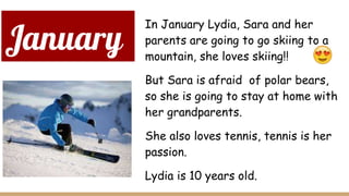 Lydia is excited for her many planned activities throughout the year which include skiing in January, Carnival in February, a tennis tournament in March, Easter in April, a trip to London in May, finishing school in June, a vacation in the Caribbean in July, a trip to Paris in August, going to the zoo in September, celebrating her 11th birthday in October, picking chestnuts in November, and awaiting Santa's arrival in December.