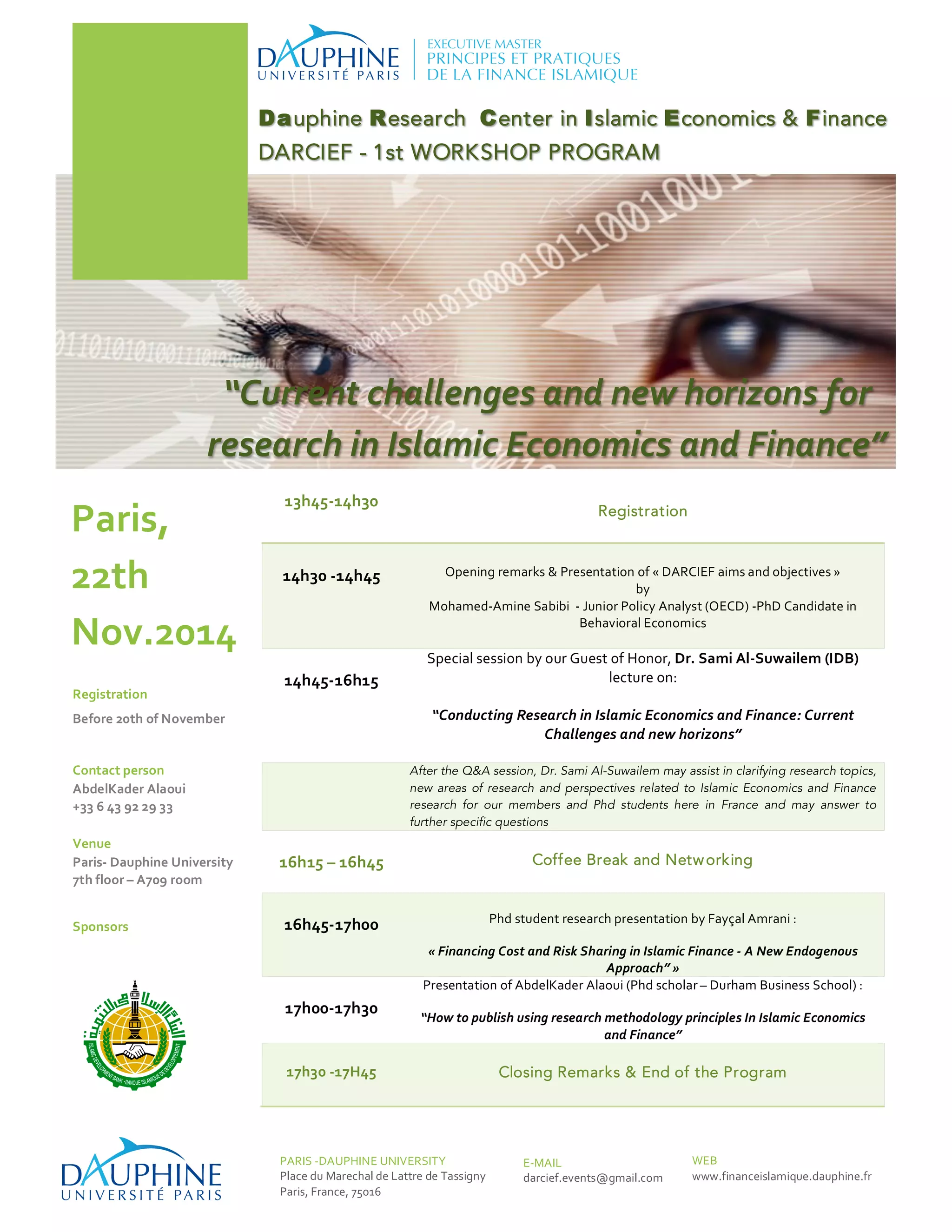 The document announces a workshop on current challenges and new horizons for research in Islamic economics and finance to be held on November 22, 2014 at Paris-Dauphine University. The workshop will include presentations from guest speaker Dr. Sami Al-Suwailem of the Islamic Development Bank on conducting research in Islamic economics and finance. Presentations will also be given by PhD students Fayçal Amrani and AbdelKader Alaoui. The event aims to clarify research topics and perspectives in the field for members and PhD students in France.