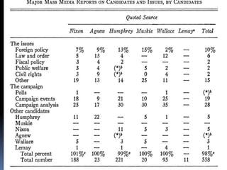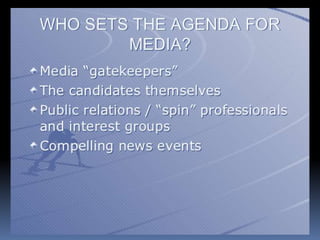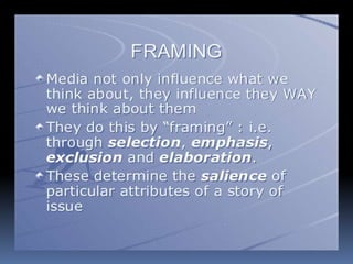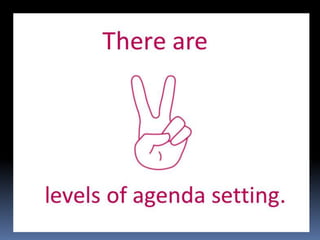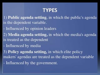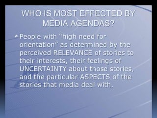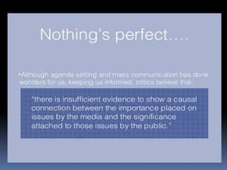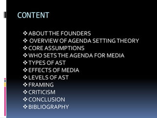This document outlines agenda-setting theory as developed by Donald Shaw and Marshall McCombs. It provides biographies of Shaw and McCombs, who established agenda-setting theory based on a study of the 1968 US presidential election. The document defines agenda-setting theory as the ability of media to influence public perception about what issues are important. It describes the core assumptions of agenda-setting theory and discusses who sets the media agenda, types of agenda-setting, the effects of media on public agenda, levels of agenda-setting, framing, criticisms of the theory, and conclusions.
