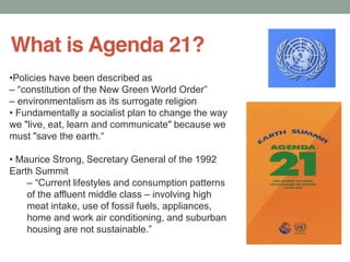 The document provides information about Agenda 21 and sustainable development. It discusses key concepts of Agenda 21 such as eliminating private property rights, population control, restricting mobility, and indoctrinating children. It notes that Agenda 21 seeks to transform nations from lands of free to lands of collective by using environmentalism as a front. Sustainable development is presented as a strategy that restricts activities deemed unsustainable and works through unelected regional councils to implement top-down centralized control against free markets and natural rights.