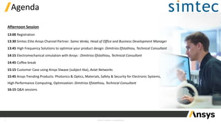 The document outlines the agenda for an Ansys event featuring various sessions, including presentations on simulation techniques, customer case studies, and trending products. Key speakers include Marko Kolenc and Dimitrios Efstathiou, who will cover topics such as CFD analysis, high-frequency solutions, and electromechanical simulation. Breaks for coffee and lunch are also scheduled throughout the day.