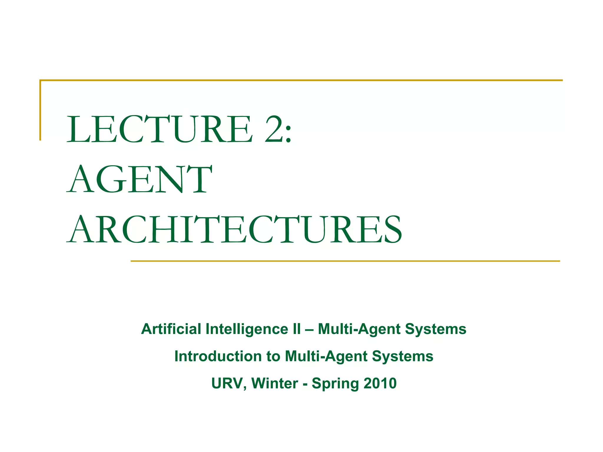 This document provides an overview of different agent architectures, including reactive, deliberative, and hybrid architectures. It discusses key concepts like the types of environments agents can operate in, including accessible vs inaccessible, deterministic vs non-deterministic, episodic vs non-episodic, and static vs dynamic environments. Reactive architectures are focused on fast reactions to environmental changes with minimal internal representation and computation. Deliberative architectures emphasize long-term planning and goal-driven behavior using symbolic representations. Rodney Brooks proposed that intelligence can emerge from the interaction of simple agents following stimulus-response rules, without complex internal models, as seen in ant colonies.