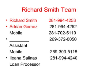 This document provides contact information for members of Richard Smith's real estate team and Scott Hudspeth's team. It also outlines various marketing strategies and tools offered by the teams, including social media marketing, video marketing, expired and for-sale-by-owner listing strategies, and client relationship management after home purchases close. The document discusses how the teams can help agents manage listings on websites, provide coaching and training, and more to grow agents' businesses and brand them as experts. It provides examples of forms and letters the teams use to communicate with clients.