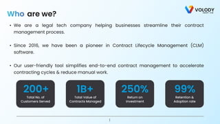 Trusted by 200+ global industry leaders like Honda Cars, Colgate, AstraZeneca, Adani, etc. Volody CLM by Volody is an Agentic AI-powered Contract Lifecycle Management (CLM) platform built to revolutionize how your enterprise handles contracts. We are proud to be known as one of the most user-friendly and easy-to-use tools on the market, helping organizations achieve tangible results like an 84% reduction in contract turnaround time and a 70% boost in team productivity.