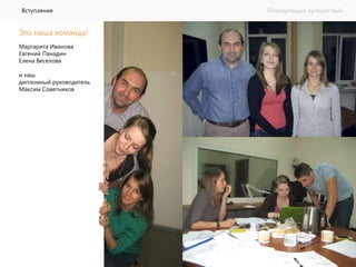 Документ представляет собой проект по разработке пользовательского интерфейса для планировщика путешествий, созданного командой студентов. Основное внимание уделяется выявлению потребностей пользователей, их проблемам и путям оптимизации взаимодействия с сайтом. В результате исследований была определена целевая аудитория – взрослеющая молодежь в возрасте 25-35 лет, заинтересованная в создании непривязанных к времени программ путешествий.