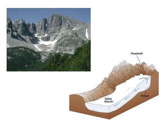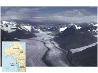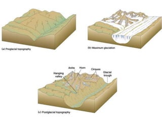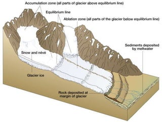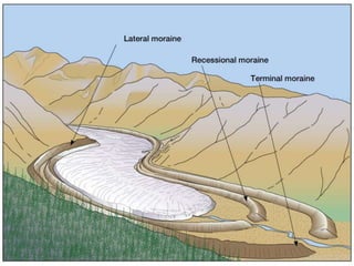 This document discusses glaciers and their landforming effects. It begins by defining what a glacier is, how they form from accumulated snow, and their two main types - continental and alpine. It then describes how glaciers erode the landscape through plucking and abrasion, polishing rock surfaces and creating U-shaped valleys. Glaciers also deposit material directly as till or in linear landforms like moraines. Examples are given of continental ice sheets that reshape entire regions and of deposition features like outwash plains and erratic boulders left by retreating glaciers. Links are provided to learn more about computers on YouTube and for computer classes.