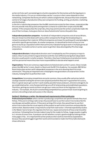 The document provides an overview of the roles and responsibilities involved in the scriptwriting process, as well as legal and ethical considerations. It discusses the roles of commissioning editors, directors, producers, script editors, agents, and script writers. It also covers topics like obtaining work, professional presentation standards, collaboration, handing over creative control, copyrighting works, avoiding plagiarism and libel, minimizing bias, and adhering to censorship standards. Overall, the document outlines the complex process and responsibilities required of scriptwriters to ethically and professionally develop compelling narratives within the media industry.