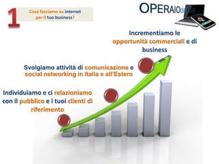 Il documento presenta i servizi offerti per le agenzie, tra cui comunicazione e social networking, creazione e ottimizzazione di siti web, e sviluppo di applicazioni per mobile marketing. Si evidenzia anche il servizio Buzzek@ per le pubbliche relazioni digitali e la distribuzione di contenuti ottimizzati. L'azienda invita le agenzie a contattarla per iniziare una collaborazione.