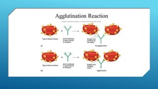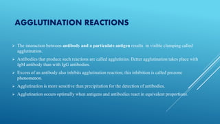 Agglutination is the clumping or clustering of antigens by antibodies. It occurs when antibodies bind to particulate antigens in equivalent proportions, causing the antigens to crosslink and aggregate. Better agglutination is seen with IgM antibodies than IgG antibodies. Agglutination involves antigen-antibody binding at the zone of equivalence according to the lock-and-key principle. This binding leads to the formation of a visible lattice structure as antibodies crosslink multiple antigen molecules.
