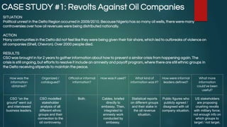 The document discusses 4 case studies involving the US State Department's Conflict and Stabilization Operations (CSO) unit gathering information on political situations from informal leaders in volatile countries. It describes how CSO obtained information from interviews and contacts in Nigeria regarding oil company unrest, gathered intelligence on the decentralized Hamas organization, and how tools to map informal leader networks could help embassy staff and lobbying firms. The case studies provide details on the challenges of collecting accurate, up-to-date information without direct access and how the data was organized, catalogued, and used.