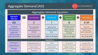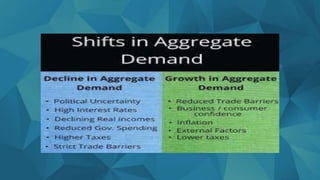 Aggregate demand refers to the total demand for final goods and services in an economy at a given overall price level and time. It is represented by the sum of consumption (C), investment (I), government spending (G), and net exports (X-M). The aggregate demand curve slopes downward, as demand increases when prices decrease. Factors that can cause shifts in aggregate demand include changes in the money supply, tax rates, government policies, consumer and business confidence, and economic conditions in other countries.