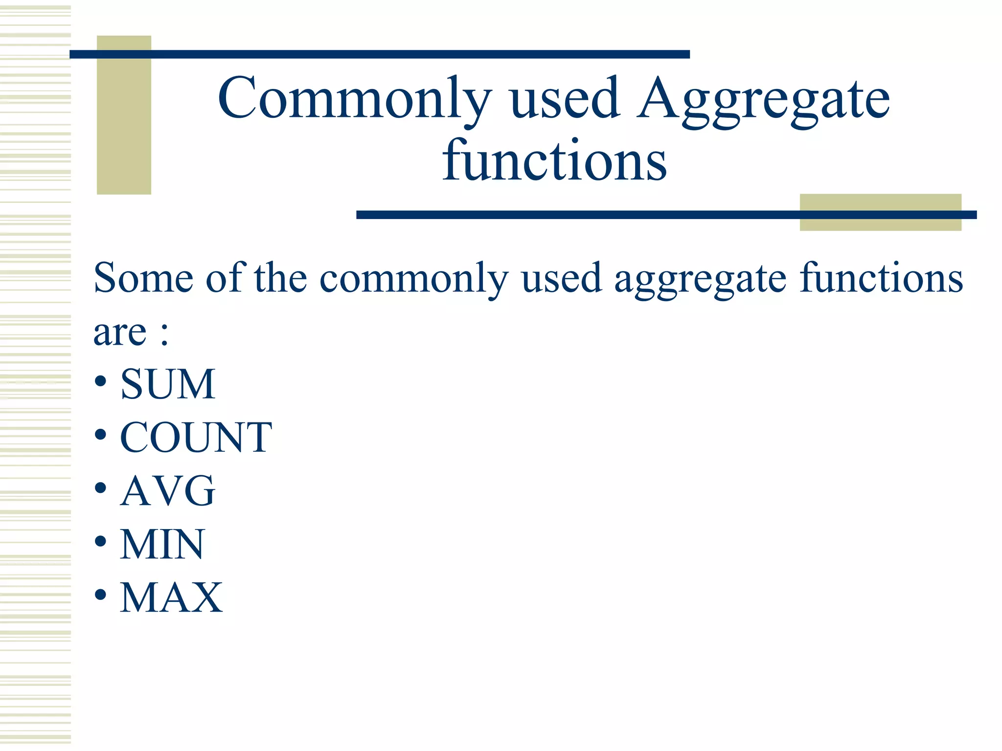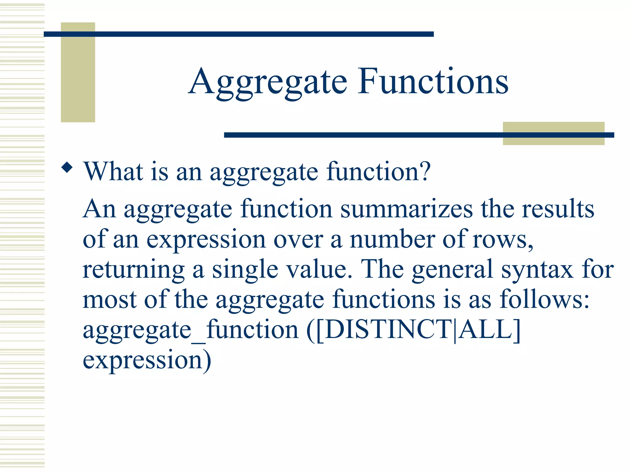 1) The document discusses various aggregate functions such as SUM, COUNT, AVG, MIN, and MAX. It provides examples of using these functions on an Employee table to calculate totals, averages, minimums, and maximums.