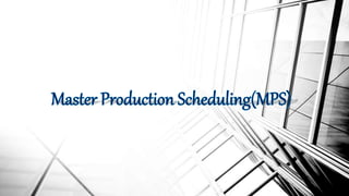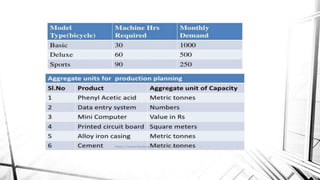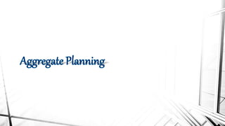 The document discusses aggregate planning and master production scheduling. It provides an overview of aggregate planning, including forecasting demand and setting output levels to meet demand. It also discusses developing a master production schedule by disaggregating the aggregate plan into specific end items and timing of production. The master schedule covers a shorter horizon than the aggregate plan, typically 6-8 weeks. It aims to balance demand with capacity and production resources.