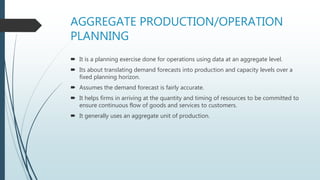 This document discusses aggregate production planning. It defines aggregate production planning as a planning exercise done at an aggregate level to translate demand forecasts into production and capacity levels over a fixed horizon. The document provides an example plan from a garment manufacturer. It discusses why production planning is necessary to address demand and capacity fluctuations. Different planning strategies like level, chase, and mixed strategies are described. The document also covers production scheduling, its objectives and functions in allocating resources and meeting delivery dates.