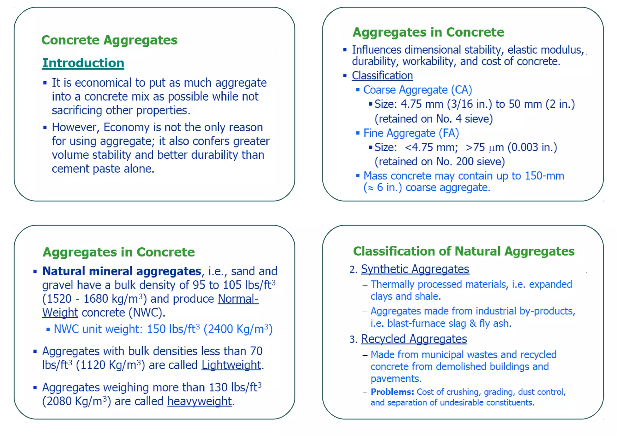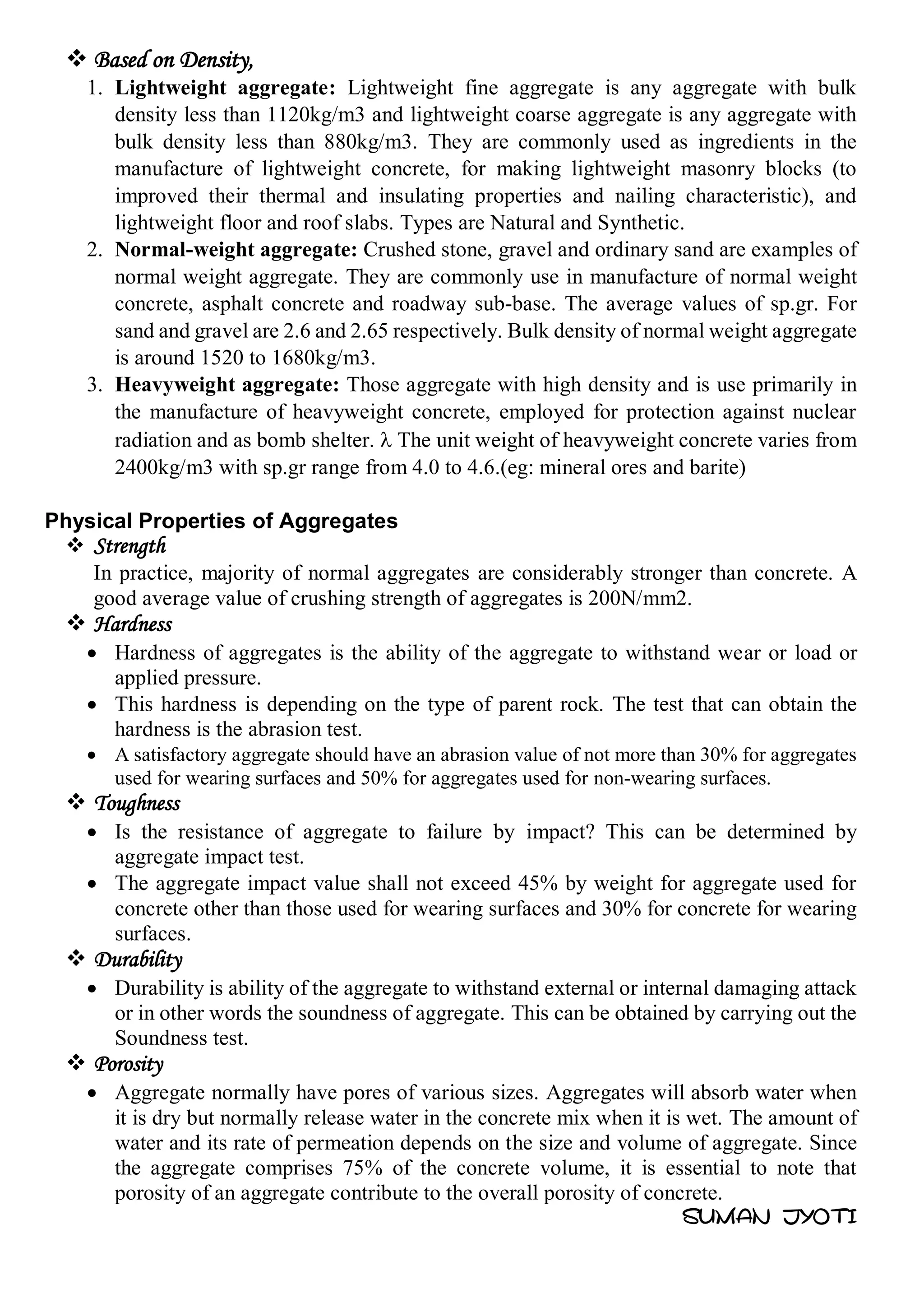 Aggregates are granular materials like sand, gravel, or crushed stone used with water and cement to make concrete. They come in two sizes: fine aggregates smaller than 5 mm and coarse aggregates larger than 5 mm. Aggregates provide strength, reduce cracking, and lower the cost of concrete. They are selected based on being hard, durable, and free of organic materials or other substances that could weaken the concrete. Aggregates are classified by size, manufacturing method, and density. Physical tests are conducted to determine properties like strength, hardness, porosity, and grading.