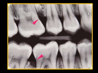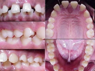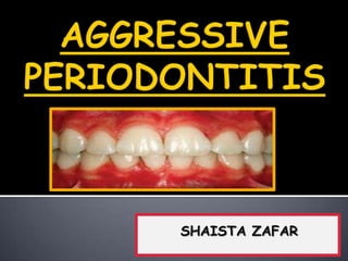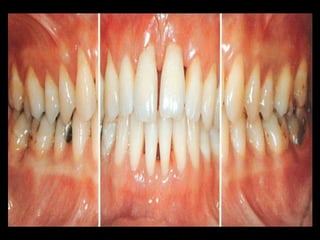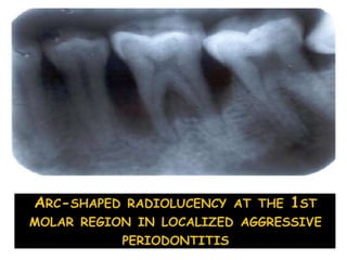 This document discusses early onset periodontitis, which comprises rare, severe, and rapidly progressive forms of periodontitis characterized by an early age of onset and familial aggregation. It describes several types including prepubertal, juvenile, and rapidly progressive periodontitis. Localized juvenile periodontitis is highlighted, which clinically presents with deep probing depths, attachment loss, and radiographic bone loss localized to first molars and incisors in otherwise healthy teenagers, despite minimal plaque and gingivitis. Treatment involves nonsurgical and surgical approaches along with antibiotic therapy.