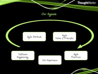 The document discusses agile software development methodologies, highlighting their principles, values, and practices such as continuous delivery and customer collaboration. It presents the Agile Manifesto, emphasizing the importance of working software, team interactions, and responsiveness to change. Various agile practices like pair programming, test-driven development, and user stories are also outlined to illustrate effective software development approaches.
