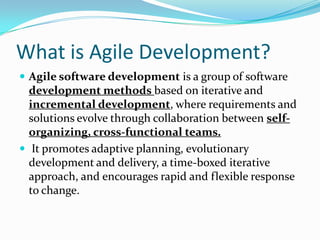Agile software development is an iterative approach that emphasizes collaboration between self-organizing teams. It promotes adaptive planning, evolutionary development, and rapid response to change. Key characteristics include breaking work into small increments, short iterations of 1-4 weeks with full development cycles, cross-functional teams without hierarchy, and face-to-face communication. Agile differs from traditional methods by focusing more on collaboration and working software than documentation. Common challenges to adopting agile include getting individuals to work as cohesive teams and increasing transparency.