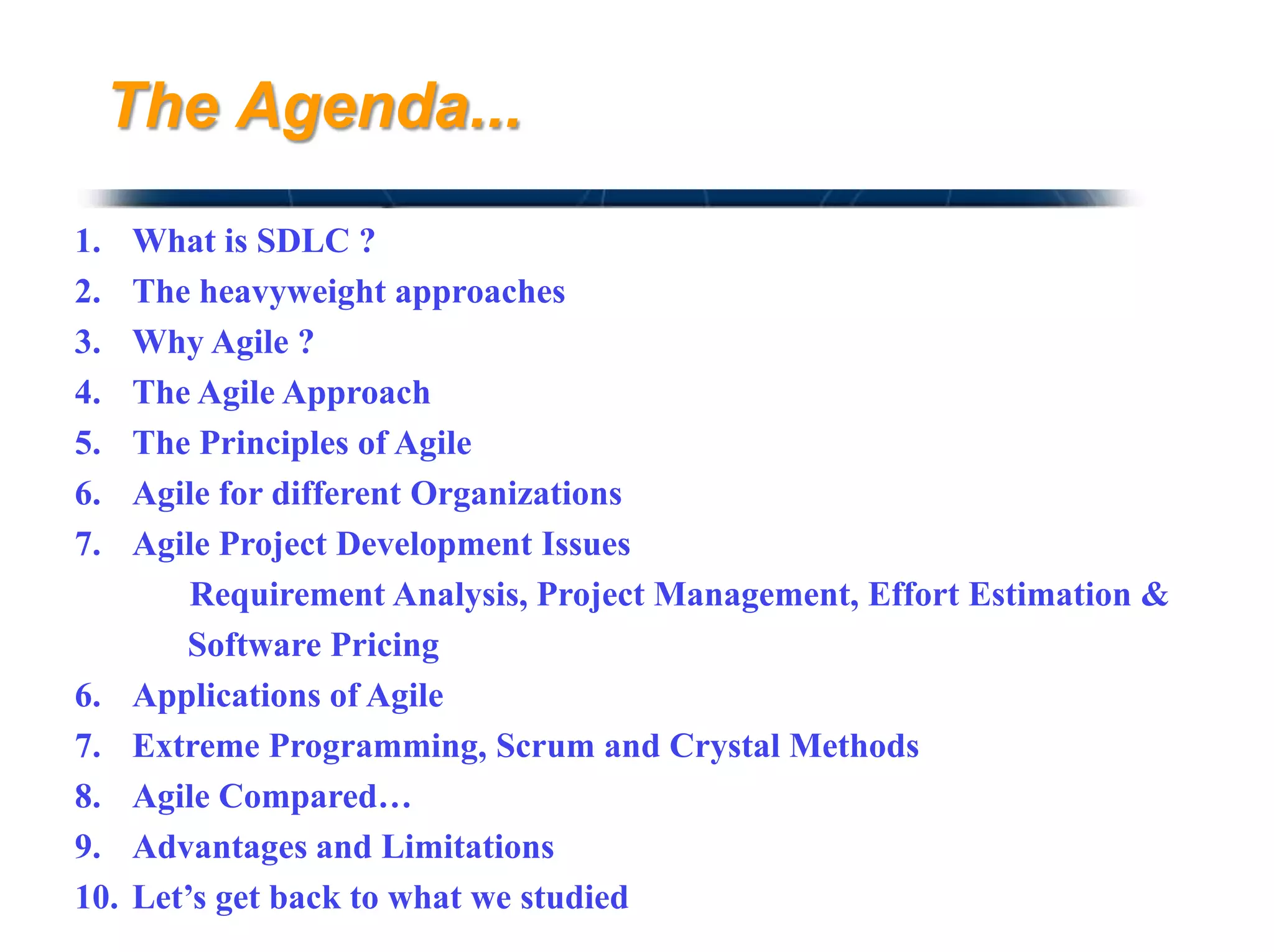 The document discusses agile software development methodologies. It begins with an overview of traditional software development lifecycles and heavyweight approaches like waterfall modeling. It then introduces why agile approaches were developed, focusing on principles like rapid delivery, accommodation to change, and close cooperation between developers and customers. The rest of the document details specific agile practices and methodologies like scrum, extreme programming, and crystal methods. It compares agile and traditional approaches and discusses both the advantages and limitations of agile development.