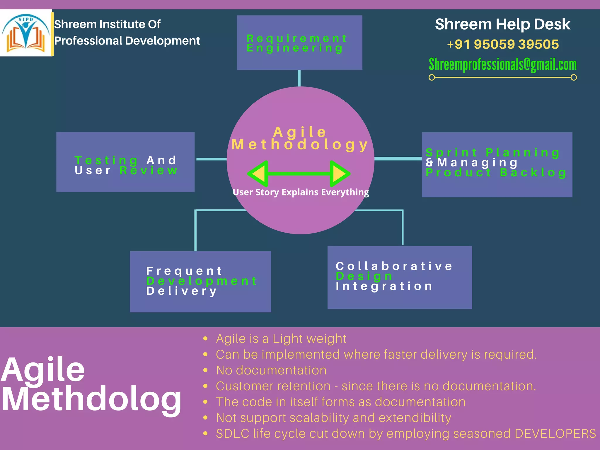 Agile methodology allows for lightweight implementation aimed at faster delivery, though it lacks extensive documentation, relying instead on code as documentation. It emphasizes customer retention through collaboration, but may struggle with scalability and extensibility. Key components include seasoned developers, testing, user reviews, sprint planning, managing product backlog, and frequent delivery.